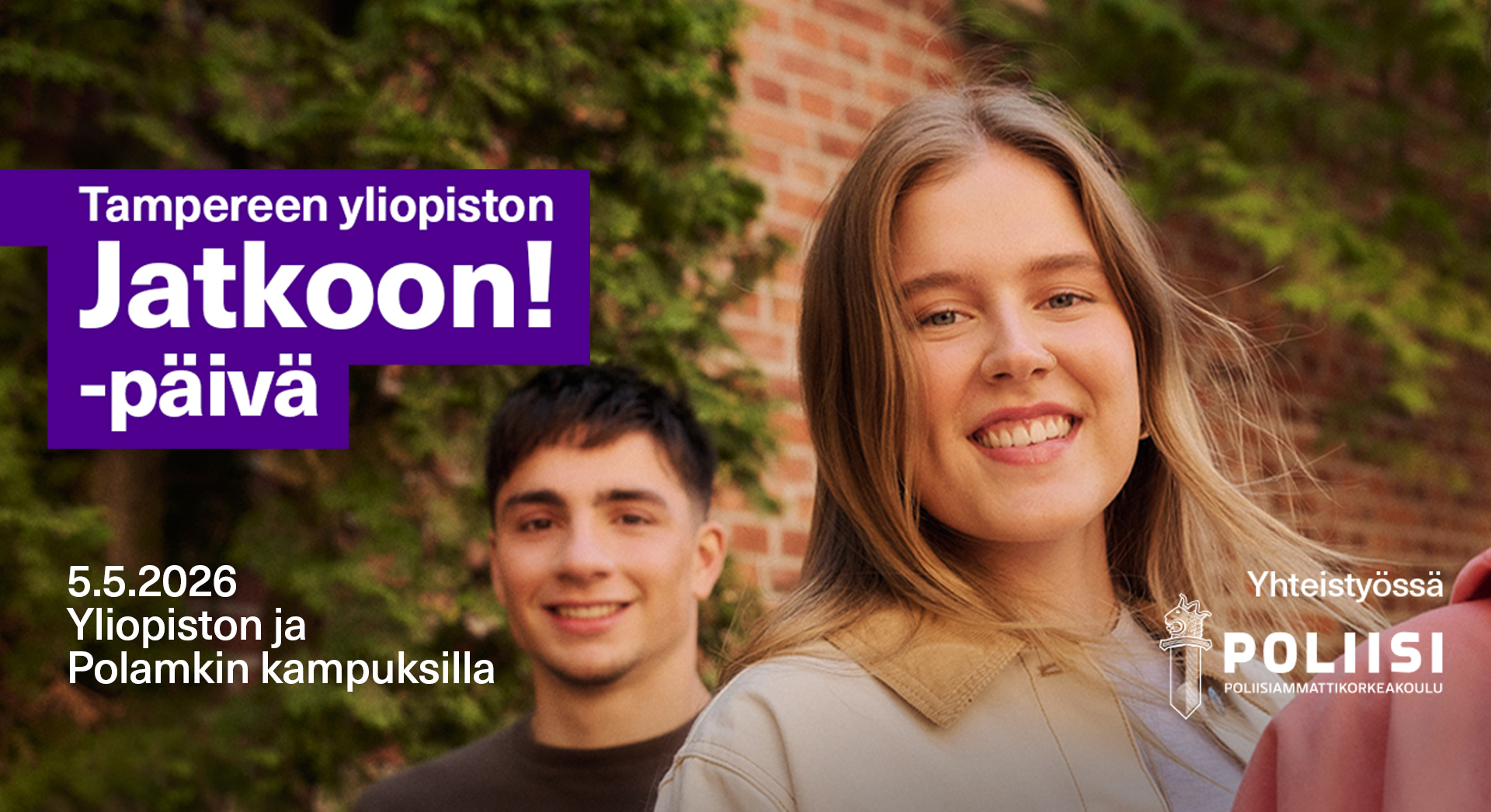 Tampereen yliopiston Jatkoon! -päivässä pääset tutustumaan yliopiston koulutuksiin kolmella kampuksella Hervannassa, Kaupissa ja keskustassa. Päivä tarjoaa mahdollisuuden tavata opiskelijoitamme eri aloilta, sekä keskustella hakemisesta, opiskelusta ja opiskelijan arjesta. Hervannassa tapahtuma järjestetään yhteistyössä Tampereen Poliisiammattikorkeakoulun kanssa.